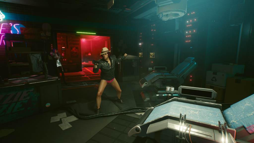 Une fois la séquence d’introduction passée, nous pourrons découvrir l’appartement de V, y faire un petit somme bien mérité avant de repartir vers de nouvelles aven… non, pas si vite ! Alors que vous êtes en route pour la quête principale et retrouver ce bon vieux Jackie Welles, dirigez-vous vers l’ascenseur permettant de sortir de l’immeuble.