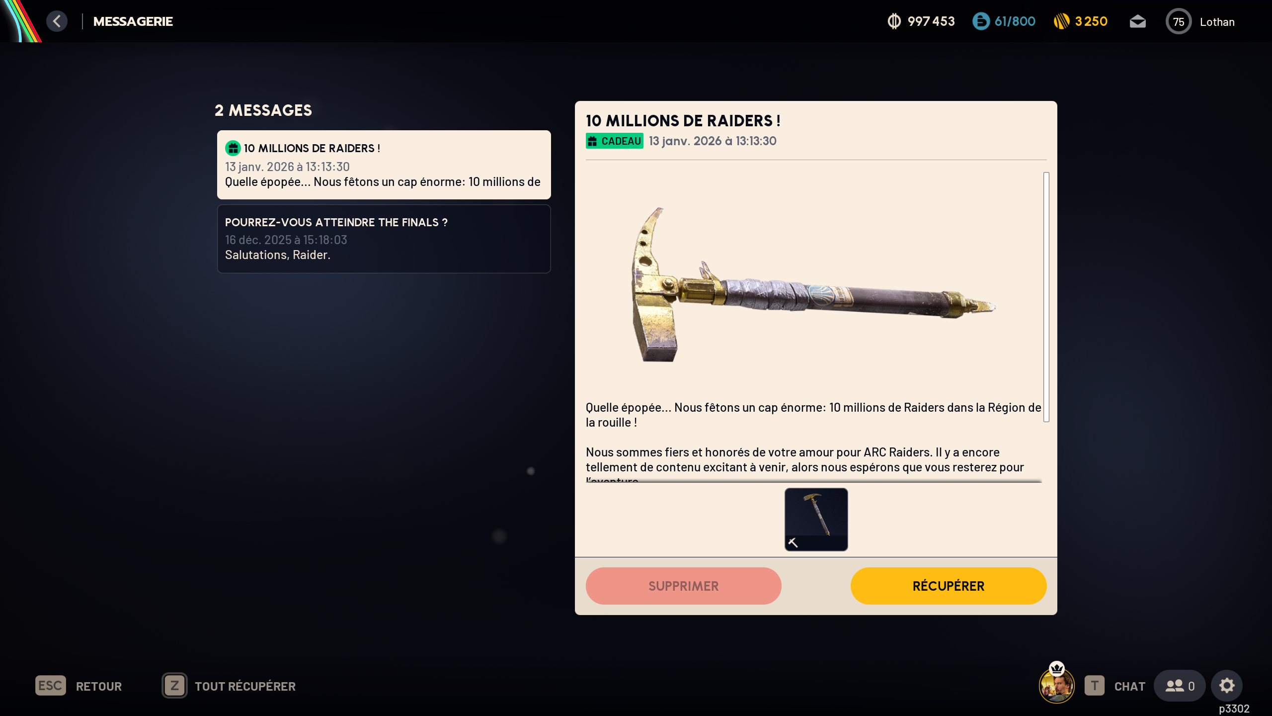 Face à cet engouement, Embark Studios a décidé de remercier l’ensemble des joueurs avec un cadeau symbolique mais très visible en jeu. Tous les joueurs ayant lancé ARC Raiders avant la mi-janvier recevront automatiquement un marteau doré exclusif, envoyé directement via la messagerie interne du jeu. À l’origine, cette récompense devait célébrer un palier inférieur de ventes, mais la croissance rapide du jeu a poussé le studio à élargir l’offre à toute la communauté active.