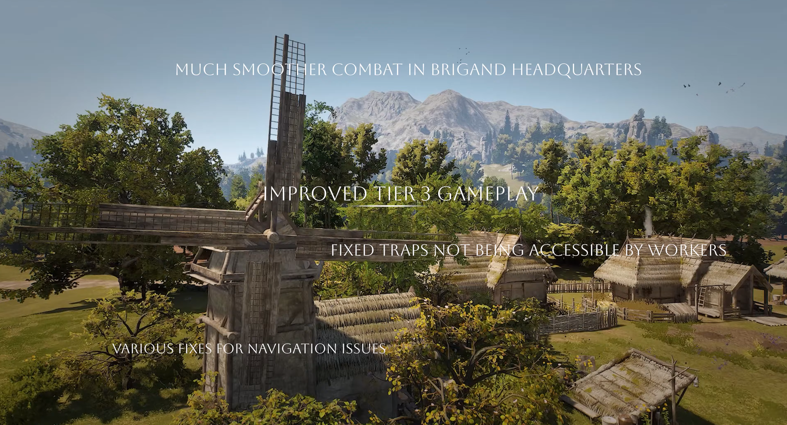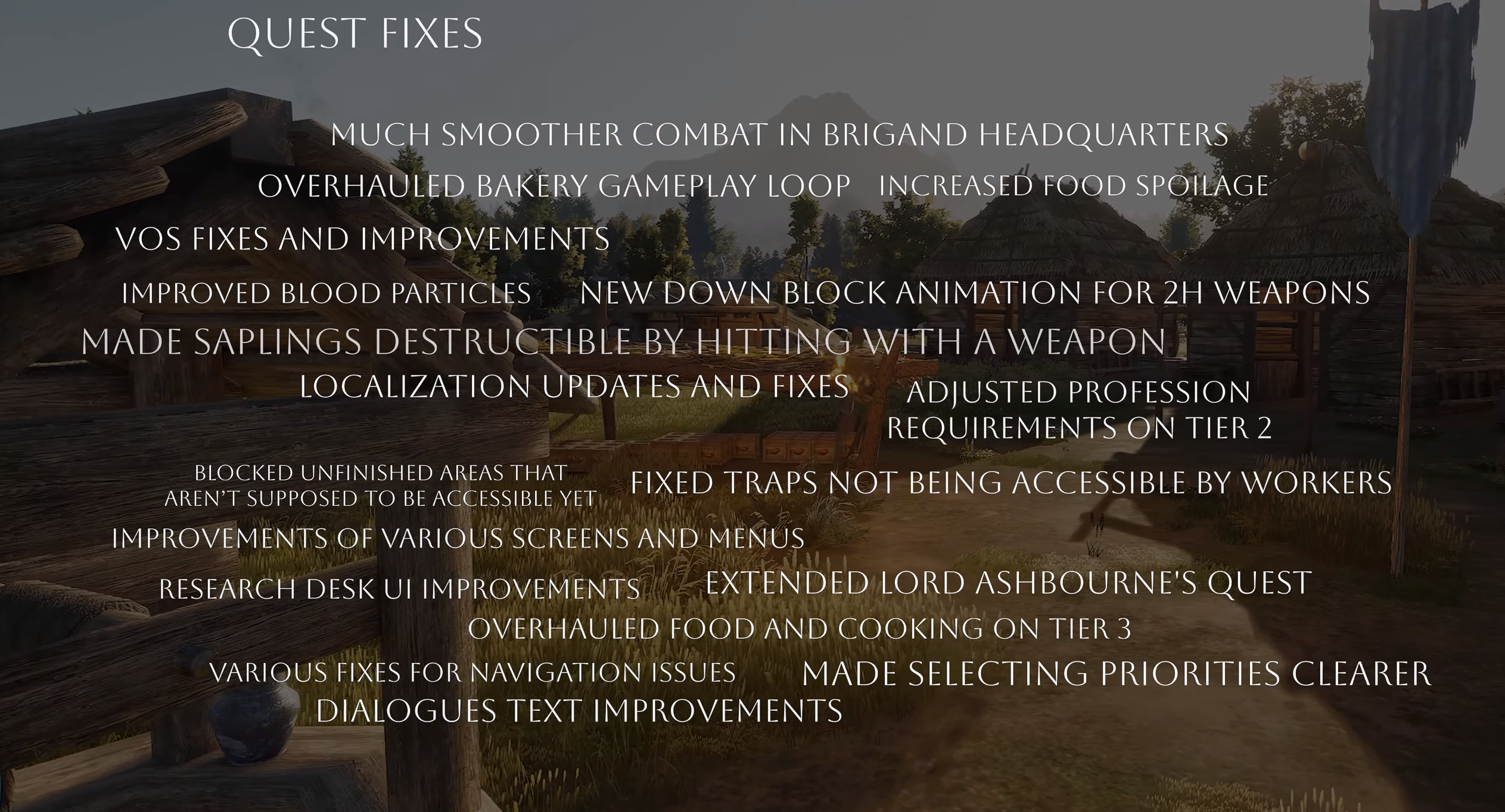 De nombreux problèmes de gameplay restants ont également été résolus. Par exemple, la plupart des armes, armures et certains bâtiments comme le séchoir n’exigent plus de villageois ayant des professions spécifiques pour être recherchés. Cette modification répond à une plainte fréquente selon laquelle l’équipement nécessaire pour combattre les brigands n’était déblocable qu’après la libération. Après avoir envisagé différentes options, les développeurs ont décidé que supprimer les exigences de profession pour certains équipements résoudrait le problème sans modifier le reste du gameplay.