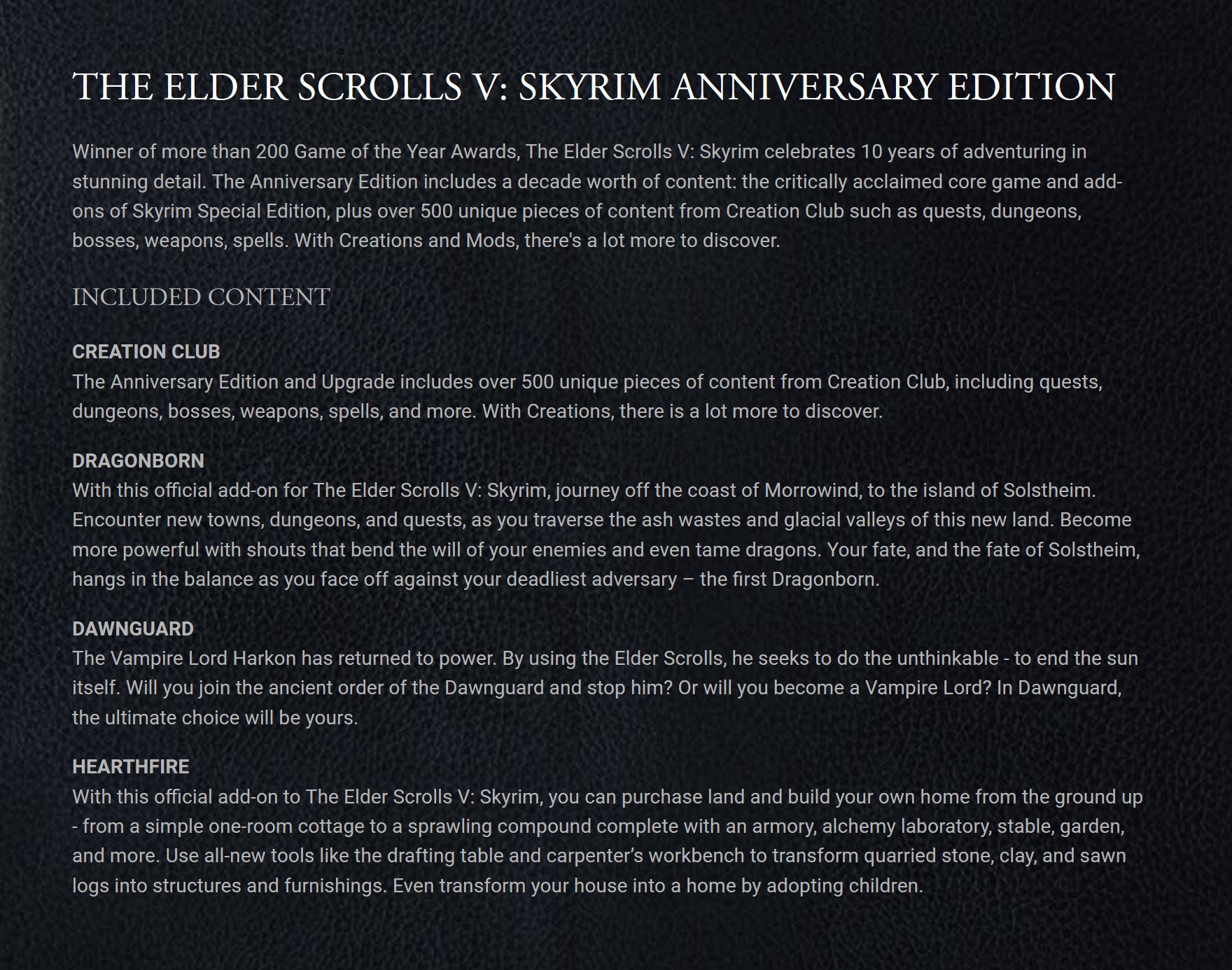 Concrètement, ce contenu comprendra la Special Edition, les extensions Dawnguard, Hearthfire et Dragonborn, ainsi que plus de 500 éléments du Creation Club. Ce sont donc des apparences, quêtes, objets et monstres en quantité appréciable qui sera rajoutés au jeu de base, lui insufflant une nouvelle, nouvelle, nouvelle jeunesse.