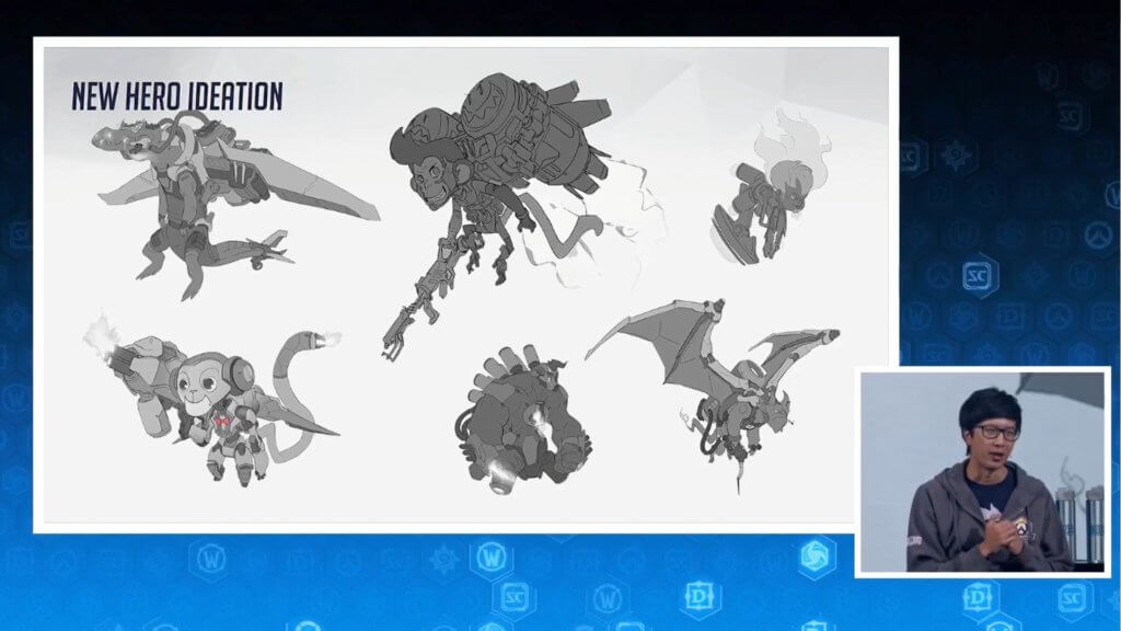 Petit à petit, des visuels et des noms ont été développés pour ces archétypes, comme vous pouvez le constater ci-dessous. Imaginer cinquante archétypes différents est un travail titanesque, mais Kaplan et ses équipes ont finalement trouvé l’idée intéressante, voir carrément entraînante. On notera par exemple que Pharah s’appelait à la base Mercy, cette dernière étant connue sous le nom de… Angelica. Winston et Symmetra étant plus ou moins similaires à ce que l’on connaît aujourd’hui, tandis que Iris semble une version de la future Athéna.