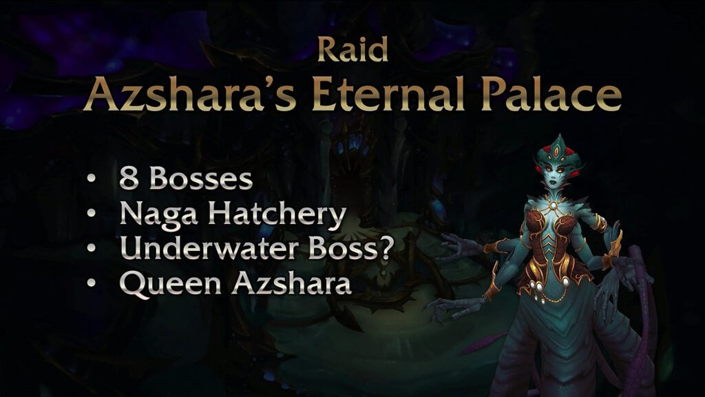 - Nouveau raid : Azshara’s Eternal Palace. 8 boss sont annoncés, dont Azshara elle-même