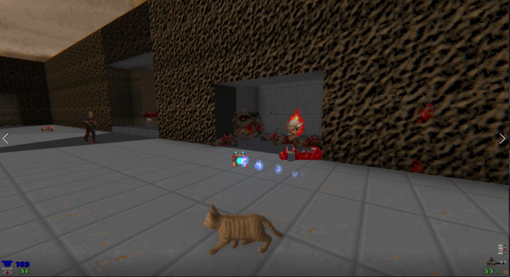 C’est cette fois-ci le héros poilu de Stray qui change de dimension et devient le personnage jouable de Doom. Le jeu développé par id Software prend ici un tournant à la troisième personne où l’on peut incarner le potichat du jeu de Blue Twelve Studios. Et si l’aspect pratique des choses peut paraître impossible, ne vous inquiétez pas : le chat utilise un robot flottant, similaire à celui de Stray, pour effectuer les tueries à sa place. Le DoomCat peut cependant, fidèle à sa nature, se rouler sur le sol en plein milieu d’un combat.