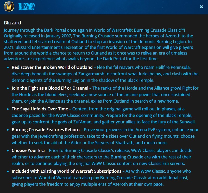 Un an après un sondage effectué auprès des joueurs, il semblerait bien que The Burning Crusade : Classic soit en route ! La BlizzConline ne commencera pas avant demain soir, mais Blizzard a fait une petite erreur de timing, laissant échapper que des serveurs dédiés à la première extension de World of Warcraft arriveraient dès cette année.