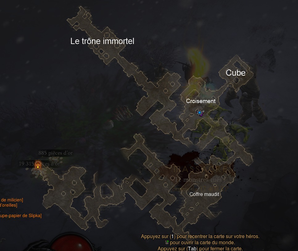 - Donc si vous avez la bonne prime, téléportez-vous la-bas et suivez la flèche jaune sur la carte. Elle vous mènera vers le Sanctuaire des Anciens. Ensuite, il vous suffit de vous balader un peu dans le niveau et d’arriver a un croisement (voir Croisement sur l’image). Ensuite, sur la droite, une petite pièce contenant le cube devrait être directement sur la droite, et l’ancien viendra vous l’ouvrir. Ceci fait, retournez dans votre camp de base et profitez bien de ces sept recettes !