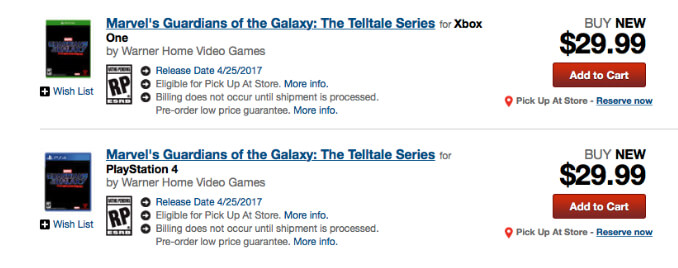 Confirmé lors des Game Awards 2016, le jeu Guardians of the Galaxy de Telltale a, pour l’instant, juste bénéficié d’un petit trailer, qui dévoile le logo. Cependant, le revendeur américain GameStop semble avoir fait une petite boulette, puisqu’il a mis en précommande le jeu et l’a accompagné d’un vague synopsis, comme indiqué sur le site de nos confrères de PCGamer. Concrètement, l’équipe de héros sera la même que celle du film, et devra affronter un ennemi « sans-pitié qui ne leur ressemble pas« . Le jeu tournera autour de la quête d’un puissant artefact, et nous fera traverser une bonne partie de la galaxie, le tout accompagné de bonne musique. Forcément.