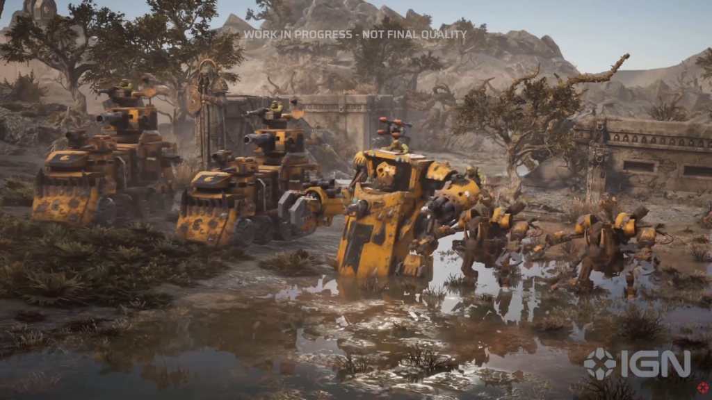 Les fiers combattants de la colonne vertébrale militante impériale (ça fait quand même beaucoup d’adjectifs !) ne seront pas jouables à la sortie du jeu, mais quelques escouades de fiers Cadiens et une courageuse Sentinelle sont visibles dans le trailers, laissant espérer soit un DLC proche de la sortie du jeu, soit une cinquième faction jouable dès la sortie.