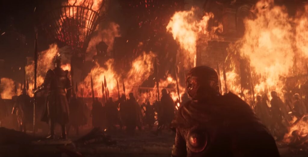 Le feu et la guerre sont ici centraux, alors que de magnifiques plans nous montrent une armée en marche contre une ville ; ça n’est pas sans rappeler la première cinématique du jeu, qui montrait des légions de soldats, avec des trolls et des armes de siège, s’en prendre à Leyndell. Les couleurs sont un peu plus vibrantes ici, puisque ce sont les infernales armées de Messmer qui partent au combat, épaulés par les brasiers bipèdes géants vus dans le premier trailer.