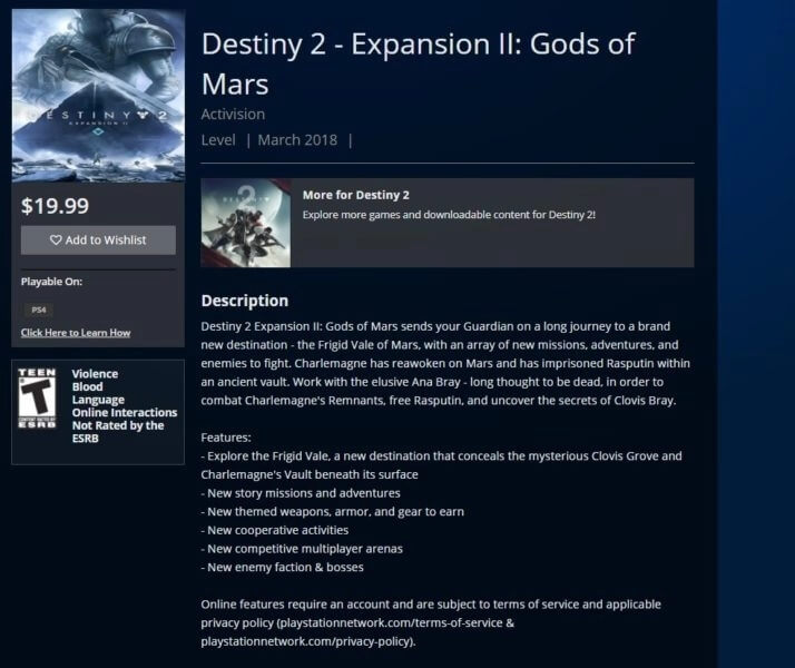 La dernière information est plus fraîche, et il s’agit cette fois-ci d’un leak – donc possiblement d’un fake, Bungie n’ayant encore rien confirmé. Un utilisateur de Reddit a pris le screenshot ci-dessous, depuis le PlayStation Store :