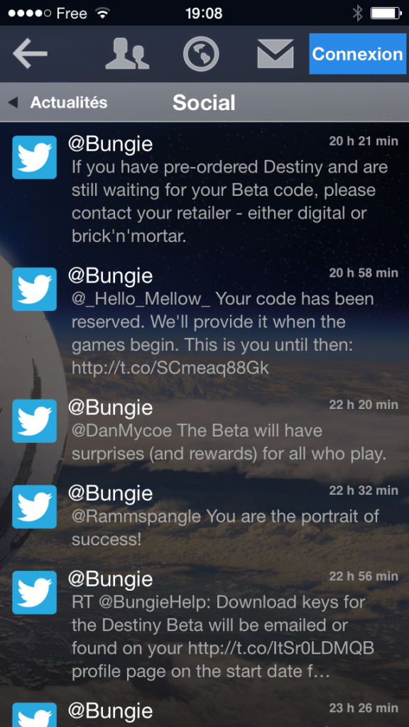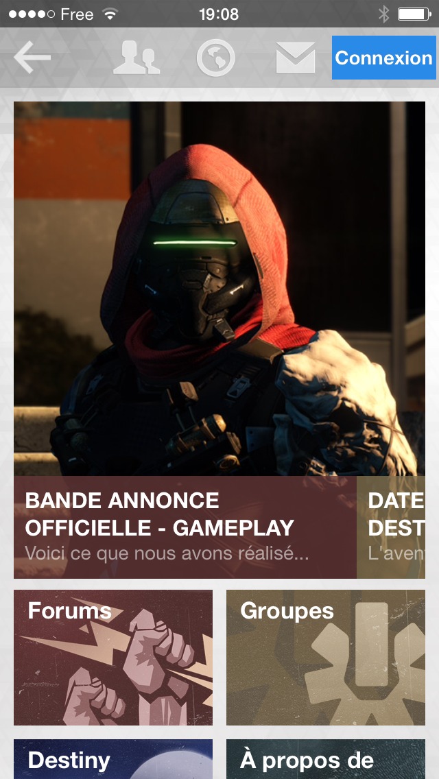Depuis environ un an, Bungie fait beaucoup de bruit autour du jeu qui devrait, à terme, supplanter Halo – même si le cinquième opus de la série montre que John-117 n’est pas mort. Et, comme c’est à la mode, le studio vient de sortir une application. Niveau d’utilité ? Pas fantastique, mais pas useless non-plus. Au programme : les dernières news sur Destiny, des guides à venir et son profil ; on parle même d’une armurerie prochainement déployée, un peu à la manière de celle de World of Warcraft. Diverses améliorations devraient arriver au fil des mois, et attendant, deux screenshots présentant l’interface plutôt sympa :