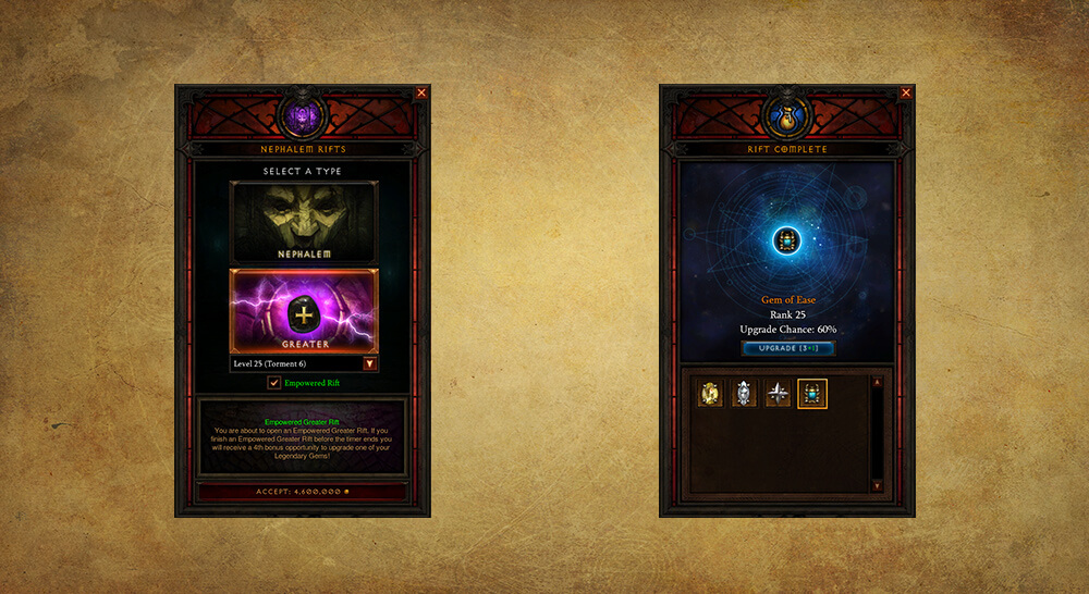 En effet, les joueurs auront maintenant la possibilité de dépenser des pièces d’or en entrant dans une faille supérieure afin de gagner des essais supplémentaires pour améliorer les gemmes légendaires en fin de faille !