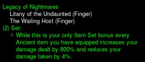 Traduisez : Tant que ceci est votre seul bonus de set, chaque objet ancien actuellement équipe augmente vos dégâts infligés de 800% et réduit vos dégâts subits de 4%