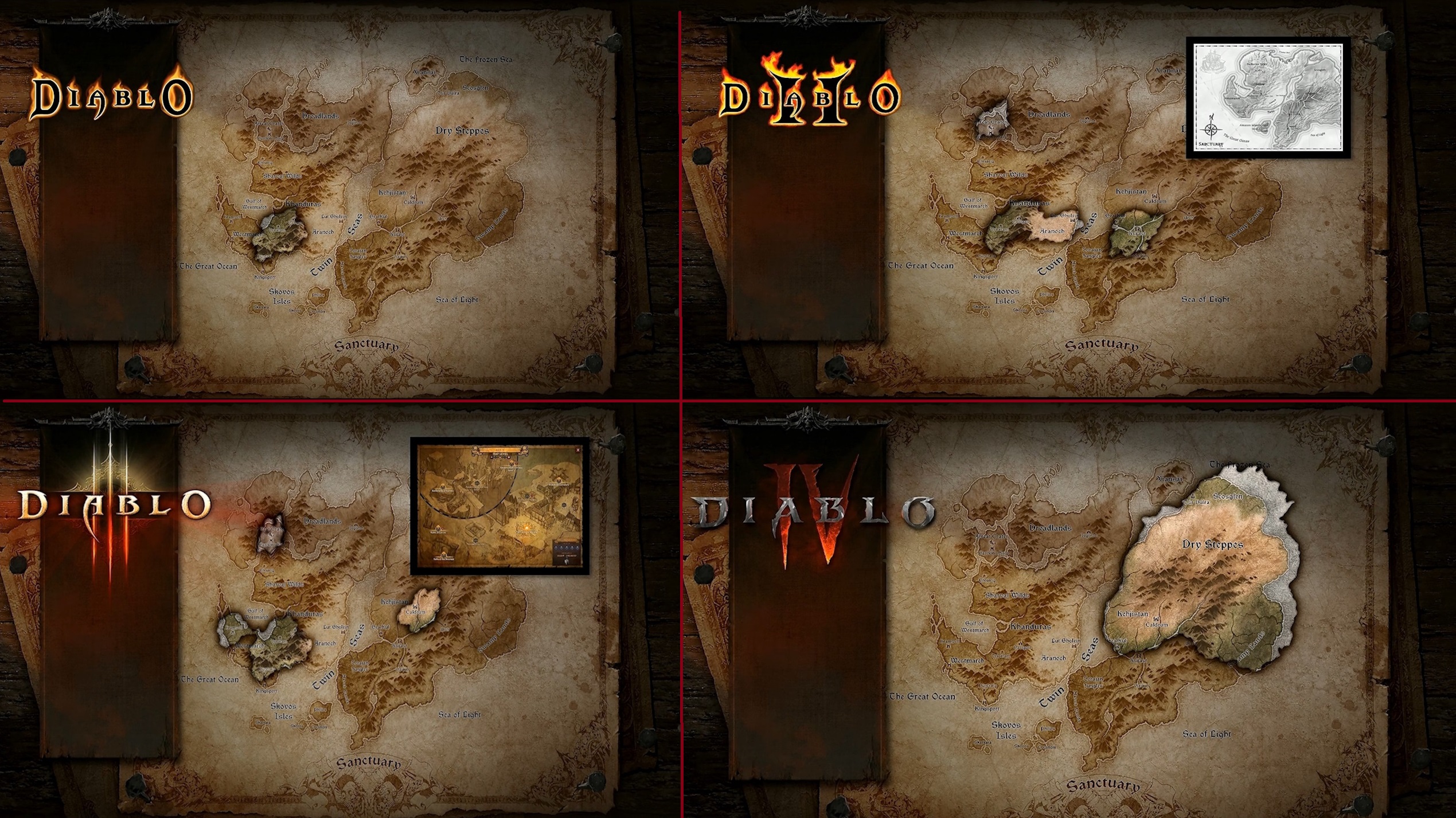 Réalisée par Worldstone.io, l’image animée ci-dessous montre que le dernier opus de la saga nous a quand même fait explorer un bon tier du monde ; bien entendu, dans les jeux vidéo, les distances sont relatives et les choses peuvent encore changer. Ajoutons également que la profondeur de l’exploration dépend des besoins de la narration, comme avec Caldeum : largement explorée dans Diablo III, la ville et ses alentours immédiats sont moins détaillés dans Diablo IV, au profit du reste du reste du Kehjistan.