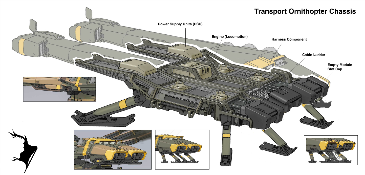 Mais les ornithoptères de transport ont d’autres utilisations, comme de transporter une grande variété de véhicules terrestres et même… d’autres ornithoptères ! Vous pouvez découvrir ci-dessous quelques concept arts réalisés par Sheng Lam et Kemp Remillard, qui donnent une assez précise – quoique pouvant changer – des véhicules volants sur Arrakis :