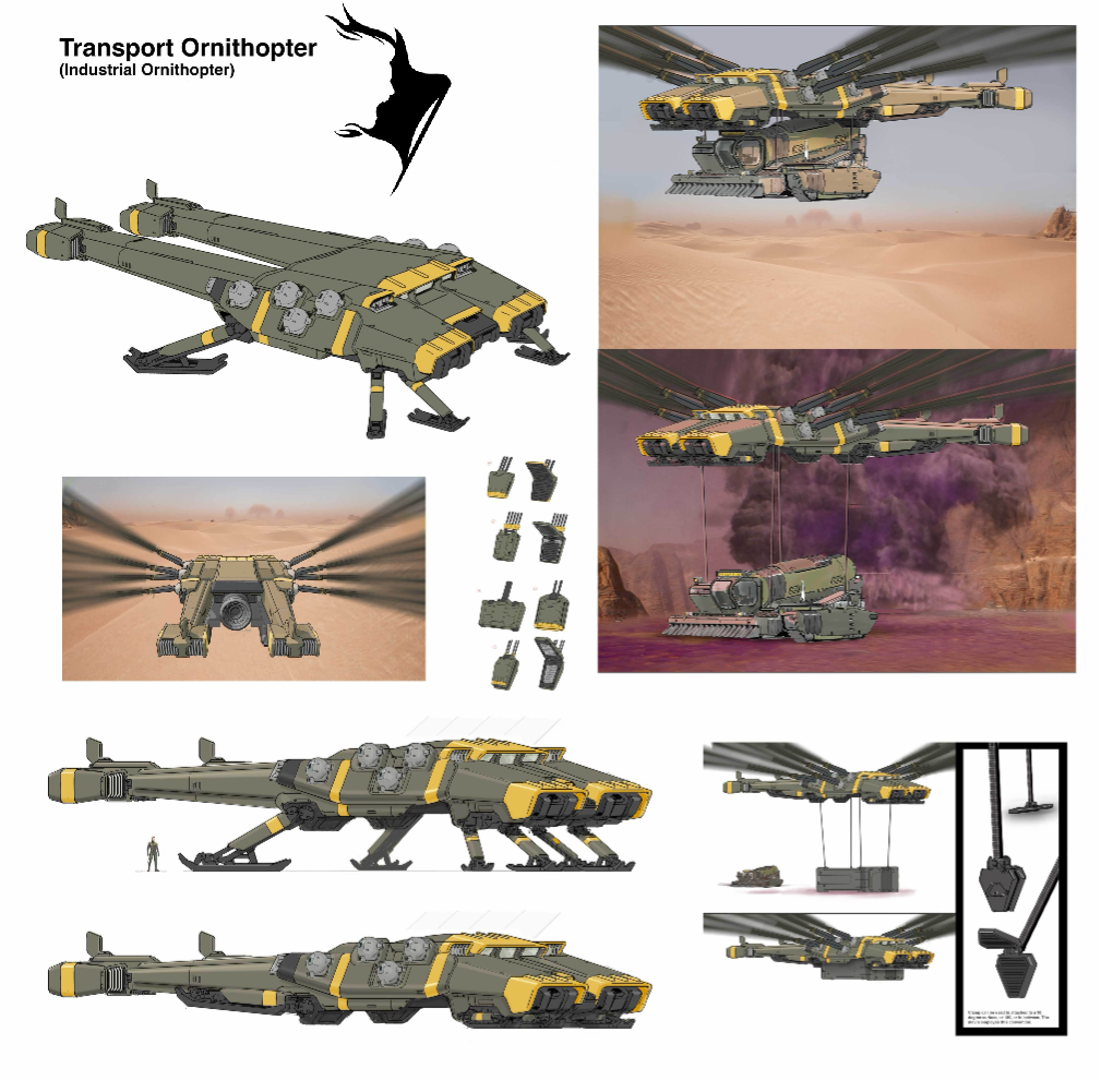 Mais les ornithoptères de transport ont d’autres utilisations, comme de transporter une grande variété de véhicules terrestres et même… d’autres ornithoptères ! Vous pouvez découvrir ci-dessous quelques concept arts réalisés par Sheng Lam et Kemp Remillard, qui donnent une assez précise – quoique pouvant changer – des véhicules volants sur Arrakis :