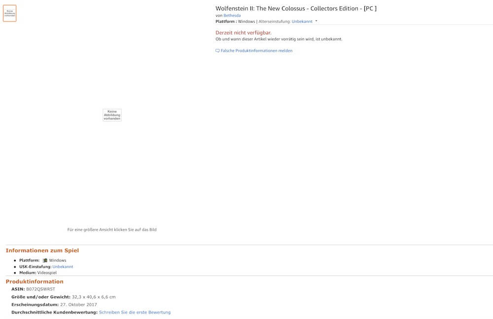 Les leaks ont l’air à l’honneur en ce moment, et c’est Bestheda qui semble en avoir fait les frais : pendant quelques minutes, la version allemande d’Amazon a affiché une date de sortie pour Wolfenstein : The New Colossus, lequel avait été annoncé il y a un an. La page a rapidement été retirée, mais bien entendu, certains internautes s’étaient déjà empressés de prendre un screenshot.