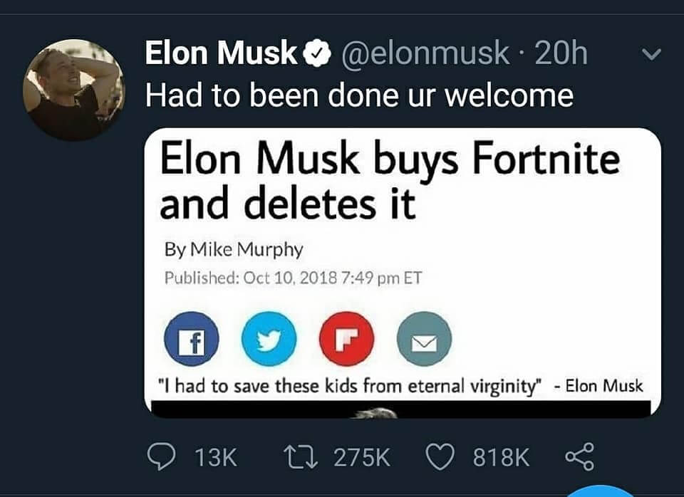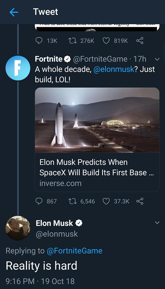 — Elon Musk (@elonmusk) 19 octobre 2018
