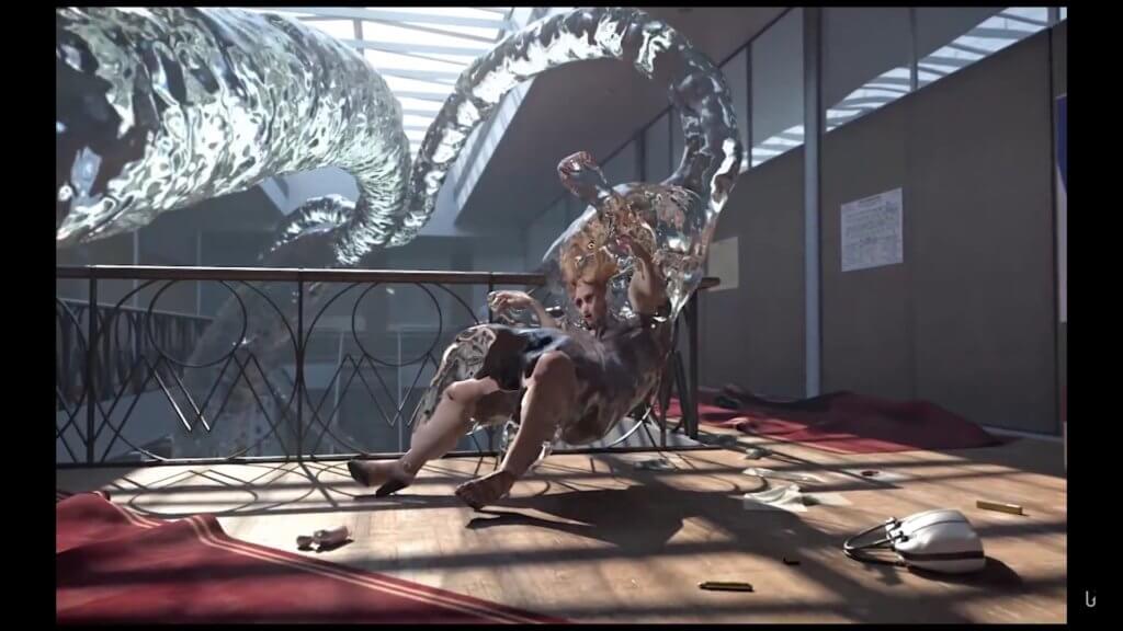 La dernière vidéo publiée par Mundfish va encore plus loin – genre, beaucoup plus loin. Dans l’Installation 3826, on découvre de gigantesques colonnes d’eau qui flottent en suspension, et dans lesquelles nagent joyeusement des petits poissons. L’une des colonnes semble retenir captive une certaine « Baba » (Grandma) Zina, et si on en juge par ses affaires dispersées autour d’elle, on peut supposer qu’elle a été prise par surprise. Qu’est-ce que tout cela veut dire ?