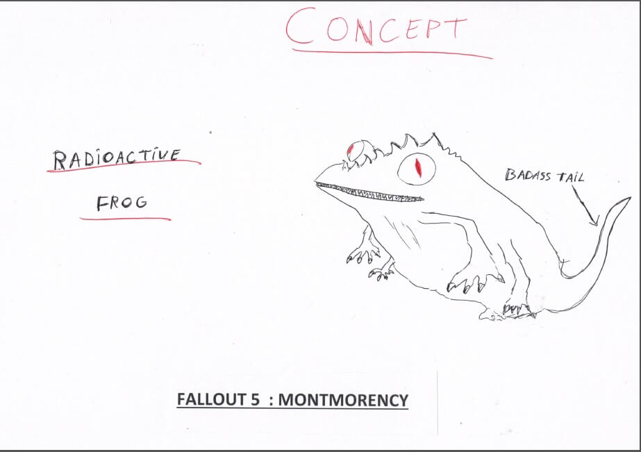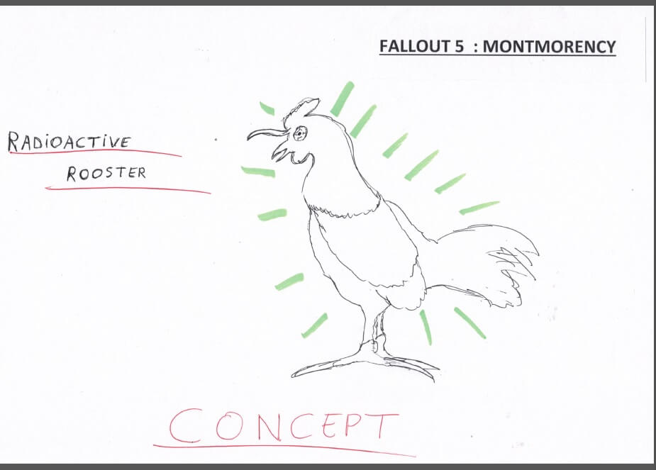 D’après les screenshots volés et les informations dispensées par NoFakeNoGain2000, Montmorency a d’abord été choisi pour son côté rétro. En effet, cette importante ville du Val d’Oise a longtemps gardé un classicisme typiquement français, que Bethesda semble vouloir exploiter dans le contexte de la Grande Guerre atomique du jeu. Les concepts art ci-dessous permettent également de se rendre compte que la faune (radioactive) sera issue de certains clichés, comme le coq (emblème national) ou la grenouille (aliment traditionnel s’il en est) :
