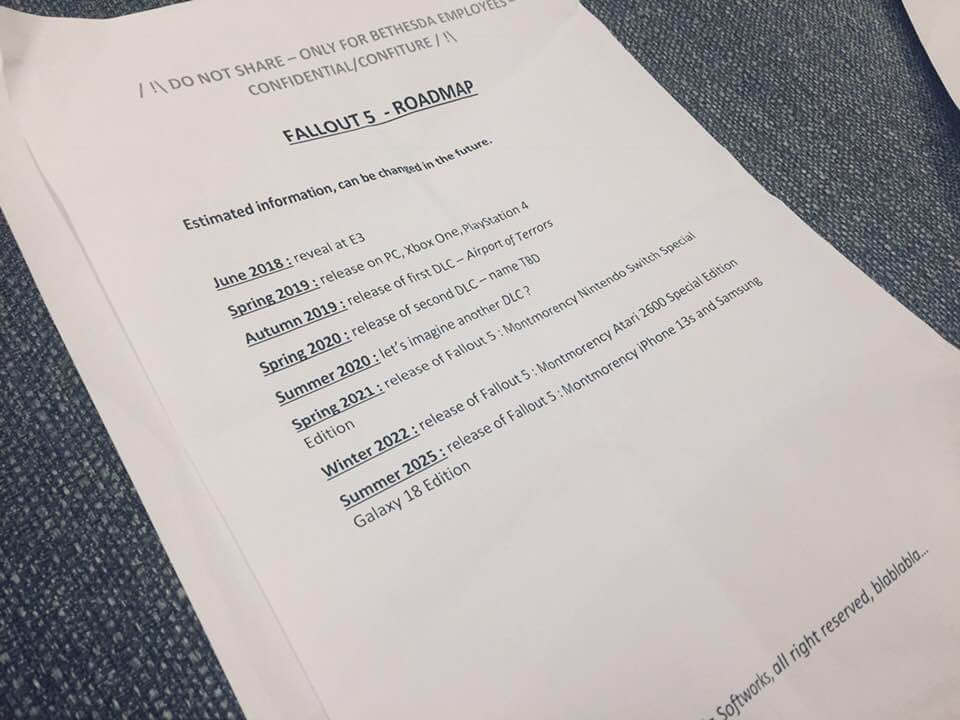 On attendait une annonce de Fallout 5 lors de l’E3, en juin prochain, il est possible qu’elle soit avancée. Bien que son compte Twitter ai été supprimé depuis, un certain NoFakeNoGain2000 a annoncé sur le célèbre réseau social détenir des informations sur le prochain opus de la saga Fallout. Tout vient du document technique ci-dessous :