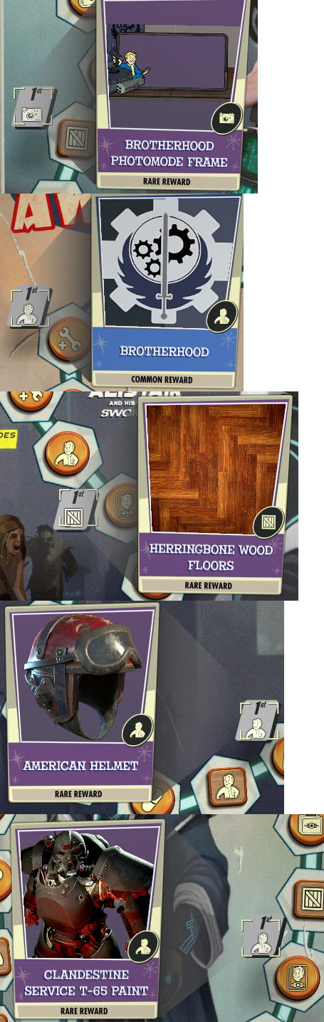 Petit bémol néanmoins, certains récompenses seront uniquement réservées aux abonnés à Fallout 1st. C’est bien dommage car, comme vous pouvez le voir ci-dessous, il y a quelques éléments stylés comme l’icône de la Confrérie de l’Acier ou encore un casque assez original !