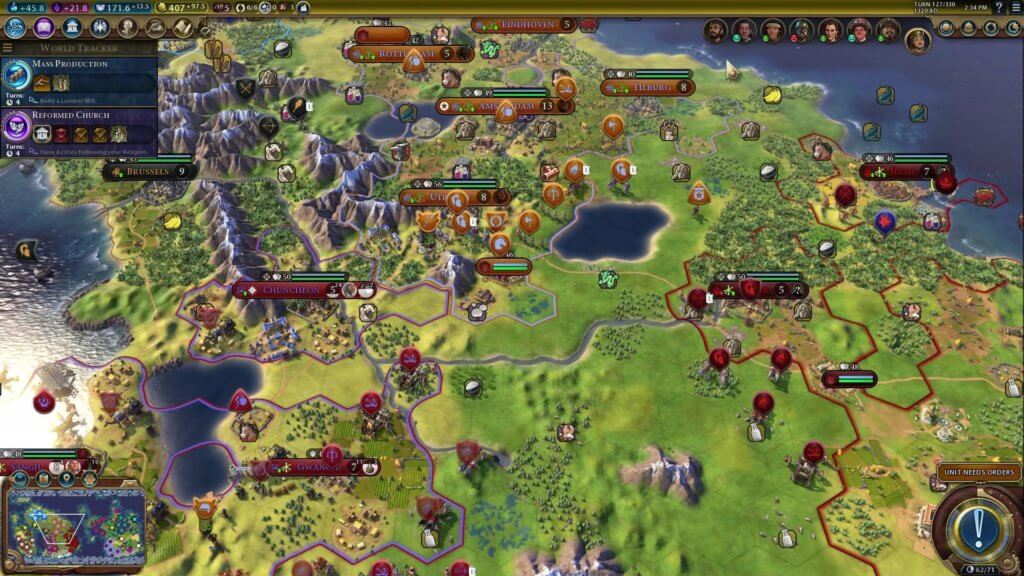 - Âges : un règne réussi durant une Ère vous fera entrer dans un Âge d’Or, où vous receverez des bonus de Loyauté, d’or et de ressources, entre autre. En revanche, un règne mal avisé vous fera pénétrer dans un Âge Sombre, où vos villes pourront se révolter ! Cela dit, cela vous offrira des doctrines uniques qui, en cas de réussite de votre civilisation, vous feront entrer dans un Âge Héroïque : il s’agit grosso-modo d’un Âge d’Or boosté avec des récompenses augmentées. Il faudra donc maintenir un score d’Ère élevé tout au long de votre partie. Ce score peut être augmenté, par exemple, en détruisant un camp de barbares près de votre frontière, ou en découvrant une merveille naturelle avant vos concurrents. Une frise chronologique, appelée ici « Timeline« , vous permettra de revivre les grands moments de votre empire.