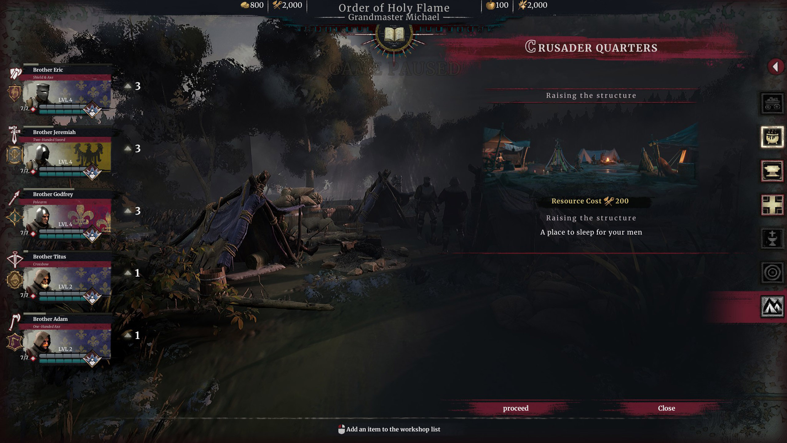 - Le campement sert de base mobile à notre groupe, et remplit plusieurs rôles. Le forgeron répare notre équipement, tandis que l’infirmerie permet de soigner nos combattants. Le campement peut être amélioré de manière globale, permettant ainsi de recruter plus de croisés.