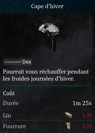 - Artisanat : Utilisez vos compétences artisanales pour fabriquer des articles essentiels. Pour créer du lin, combinez des fleurs de lin et des roseaux. Une fois le lin créé, utilisez 2 fourrures et 1 lin pour fabriquer une cape d’hiver, essentielle pour vous protéger du froid glacial. Vous pouvez créer plusieurs capes pour équiper vos ouvriers et assurer leur survie.