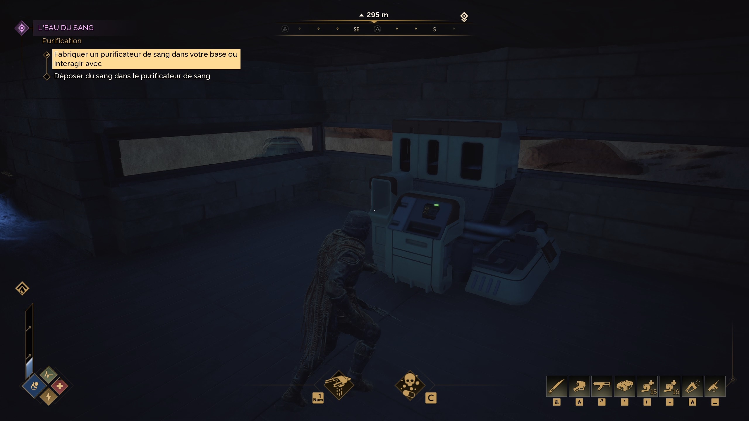 Les premières heures du jeu vous apprendront à crafter un purificateur de sang, dont l’objectif est dans le nom : transformer le sang récolté sur les ennemis en une bonne vieille eau comme on aime. Cela dit, l’interface de construction à laquelle nous sommes habitués n’est pas toujours la plus simple, et de nombreux joueurs ont reporté, dès l’early access, avoir des difficultés à repérer où se trouvait le fameux purificateur de sang dans l’interface de construction.