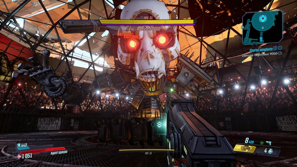 Quant aux points faibles, différents petits boîtiers rouges seront à cibler, bien que cela dépende beaucoup de la manière dont l’Agoniseur sera positionné. Une bonbonne verticale dans son dos sera aussi un morceau de choix, mais attention aux brusques retournements accompagnés d’attaques ! Lors de sa dernière phase, le boss présentera de face un noyau d’éridium qu’il faudra mitrailler sans répit.