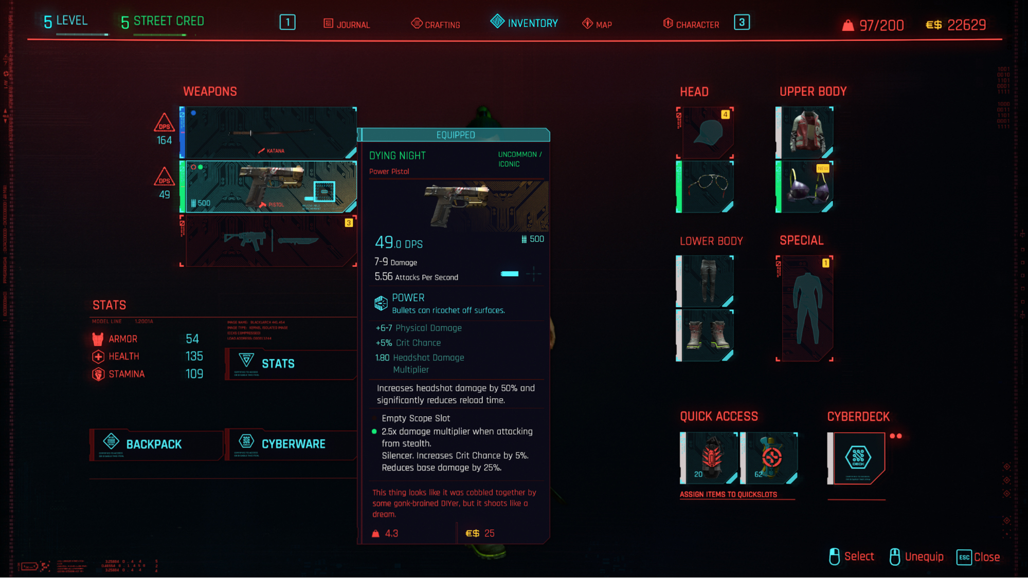 Night City est une ville extrêmement dangereuse, aussi un petit boost de dégât est toujours le bienvenu. Et ça tombe plutôt bien car le Night Pistol est une arme gratuite, hautement efficace et disponible assez tôt dans le jeu.