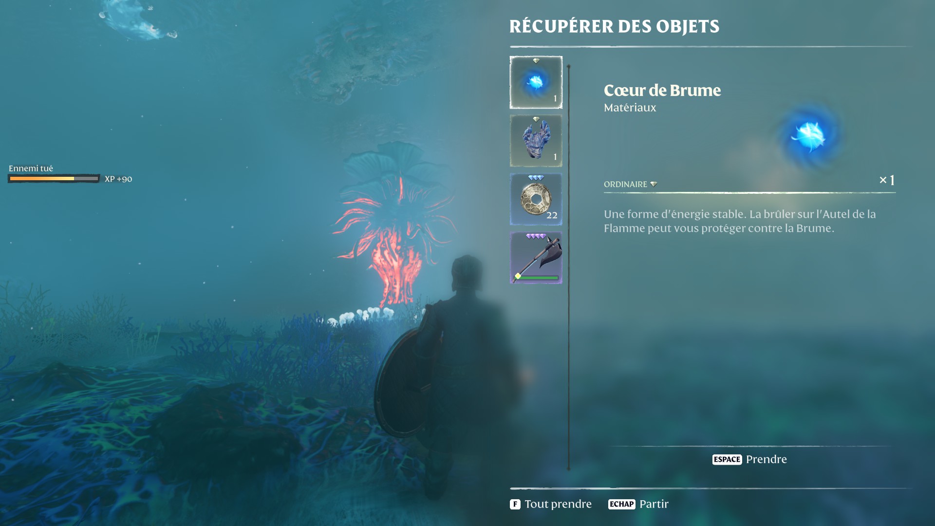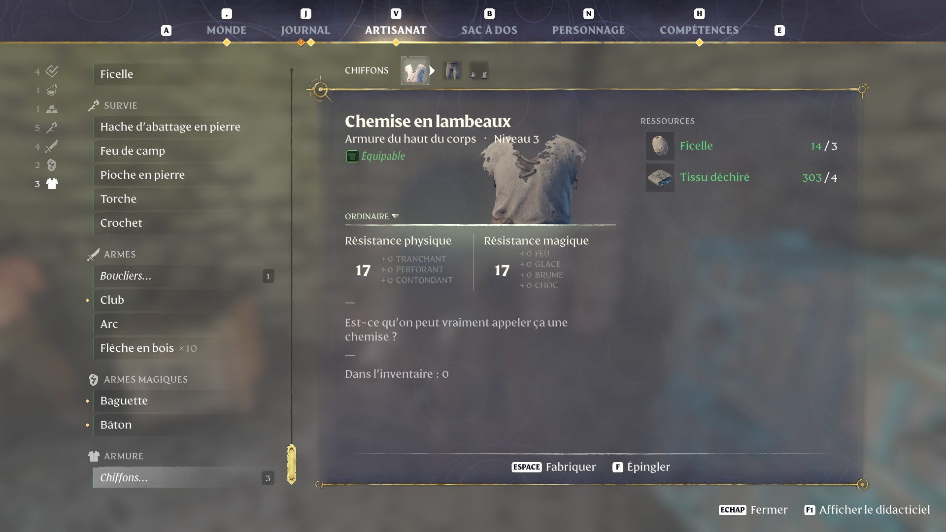 Notez bien que « pour débuter » fait ici référence aux 20 premières minutes de jeu. Dans votre menu d’artisanat, vous pourrez craft votre première armure en lambeaux. Pour ce faire, vous pouvez vous rendre dans les petites brumes autour de la plaine de départ afin de trouver les ressources nécessaires. Ainsi, vous aurez besoin de :
