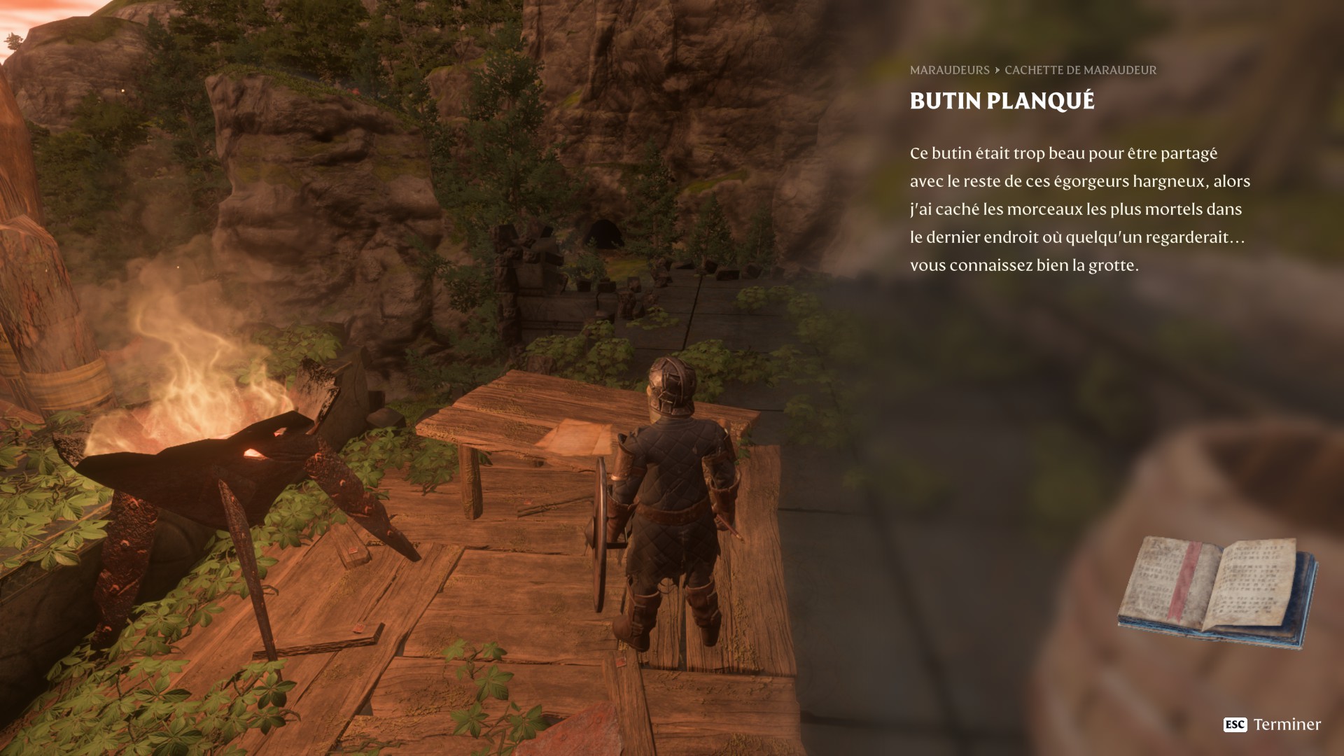En allant à la recherche de l’alchimiste, vous pourrez trouver un livre vous donnant une quête relativement proche. Dans une grotte juste à gauche du monument de l’alchimiste, gardée par des maraudeurs. Une fois que vous aurez nettoyé les environs, vous n’avez plus qu’à loot le coffre en son centre.