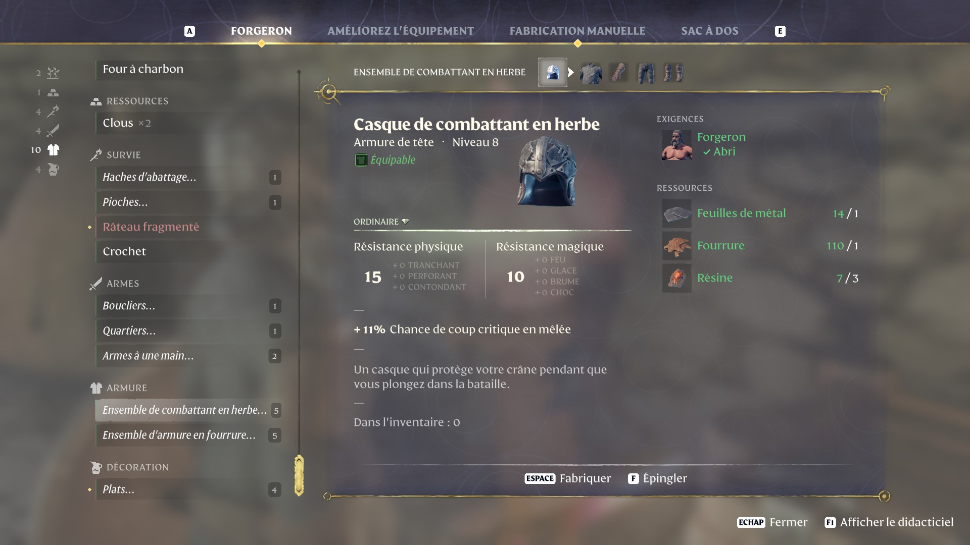 Ainsi, la forge produira des feuilles de métal à base de charbon et de ferraille. Une fois les ressources réunies, vous pourrez enfin créer l’armure du combattant en herbe.