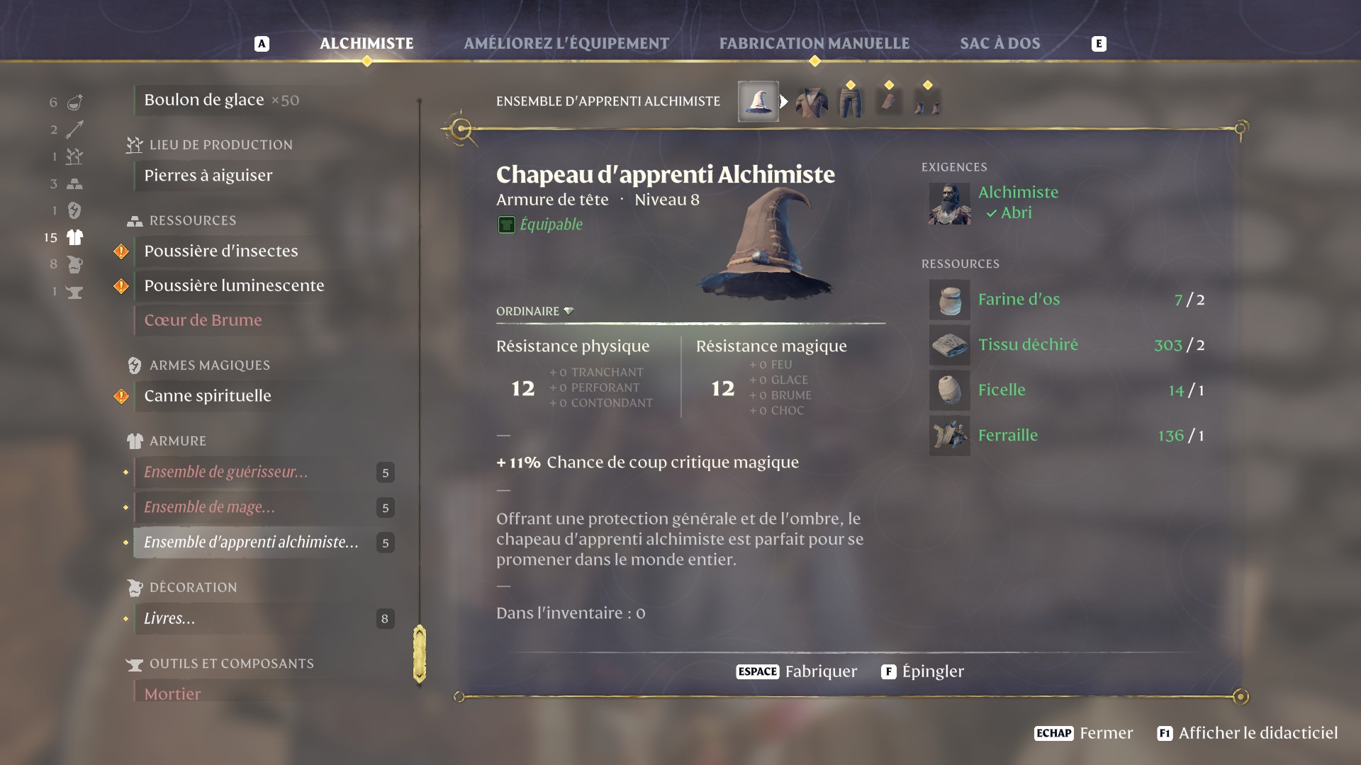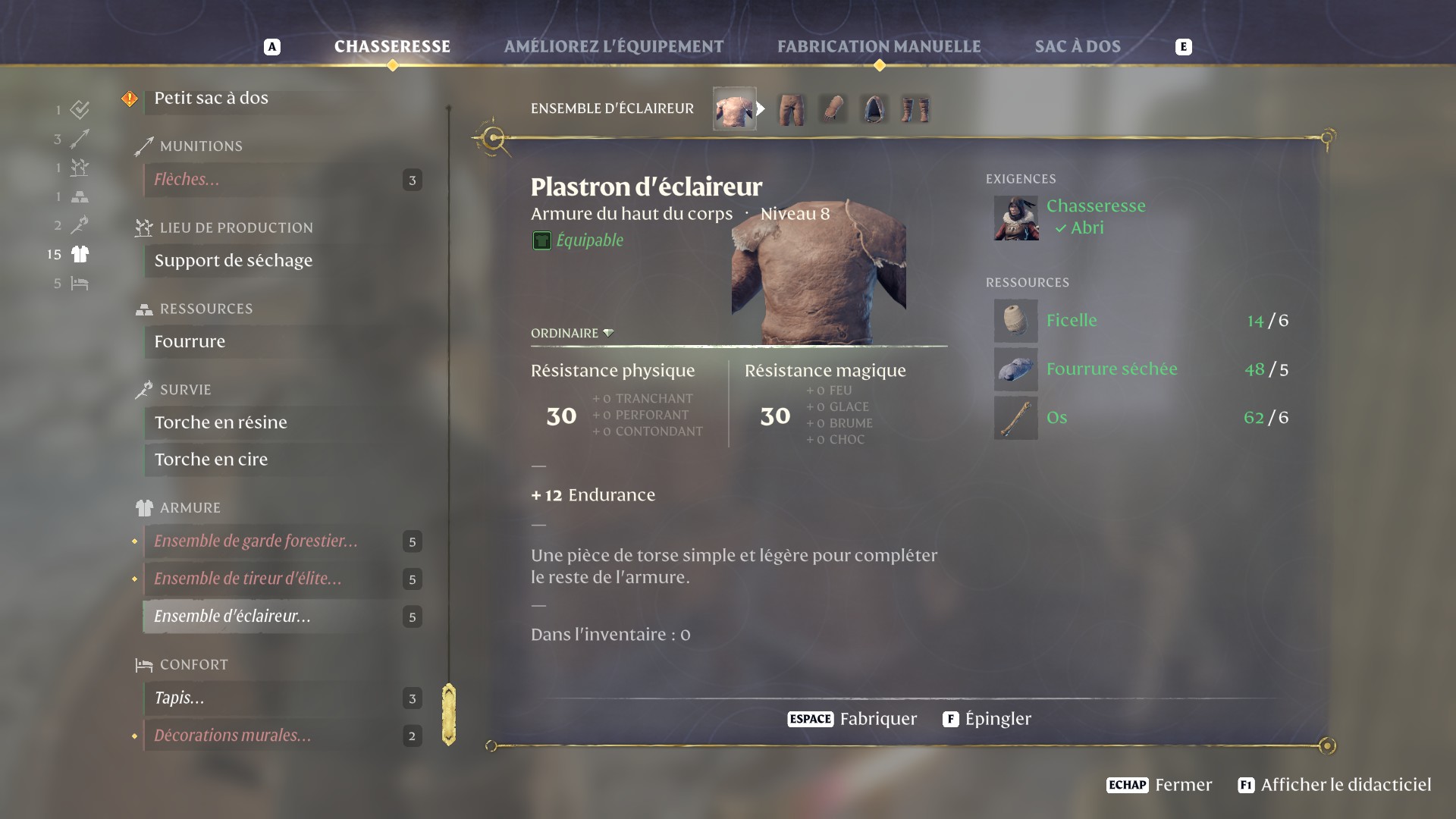 Amis tireurs d’élite, c’est à vous qu’on s’adresse maintenant. Une fois la chasseresse secourue, le premier ensemble qu’il vous est conseillé de craft est l’ensemble d’éclaireur. Vous aurez besoin de fourrure et de lin séchés pour faire cette petite pépite. Donc il vous faudra attendre d’avoir le fuseau à main et le support de séchage. Si le second se craft facilement dans le menu de la chasseresse, le premier, est à aller chercher suite à une quête de la chasseresse.