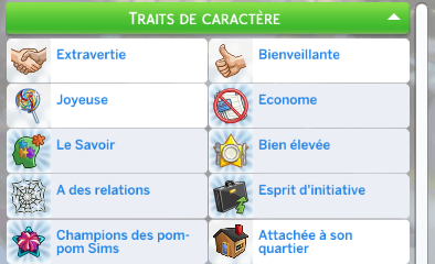- Mal à l’aise en société : Ces Sims ont du mal à gérer les situations sociales et développent plus lentement la compétence Charisme, mais obtiennent des états d’esprit et des sentiments puissants lorsqu’ils parviennent à surmonter leur gêne et leur nervosité pour lier des amitiés fortes.Notez bien que les prochains traits sont obtenable en jeu uniquement, et non pas dans le CUS. Vous pourrez les débloquer au fil de vos actions comme l’achèvement d’aspiration.