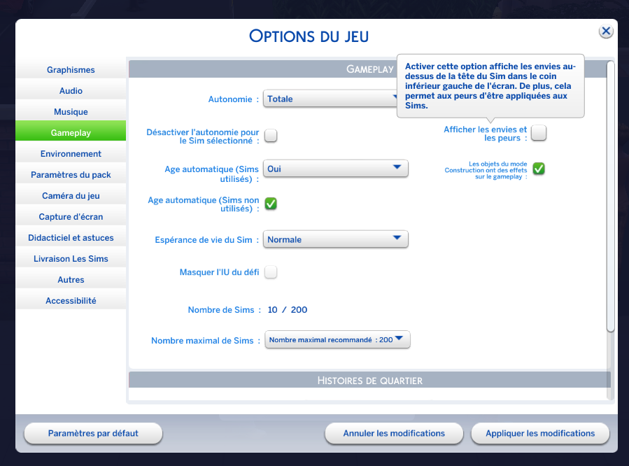 Astuce : J’ai eu quelques soucis avec les peurs pendant mon test du DLC (j’ai peut-être négligé mes Sims pour vous faire un résumé clean). En me baladant dans les options du jeu, j’ai découvert qu’on pouvait désactiver les peurs (ce que je me suis empressé de faire pour être tranquille durant mon test). Attention, cela dit, à chaque fois que je relance ma partie, cette option, que j’ai gardée désactivée, s’active automatiquement malgré la coche qui est affichée.