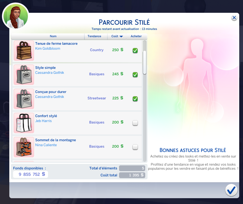 Astuce : au moment où j’écris, j’ai pu vendre une tenue à 9 999 999 Simflouz, si vous ne voulez pas passer dix minutes à taper « motherlode », c’est un moyen rapide d’obtenir énormément d’argent. Enfin rapidement, en fonction de la tendance actuelle et du style de tenue que vous tentez de vendre !