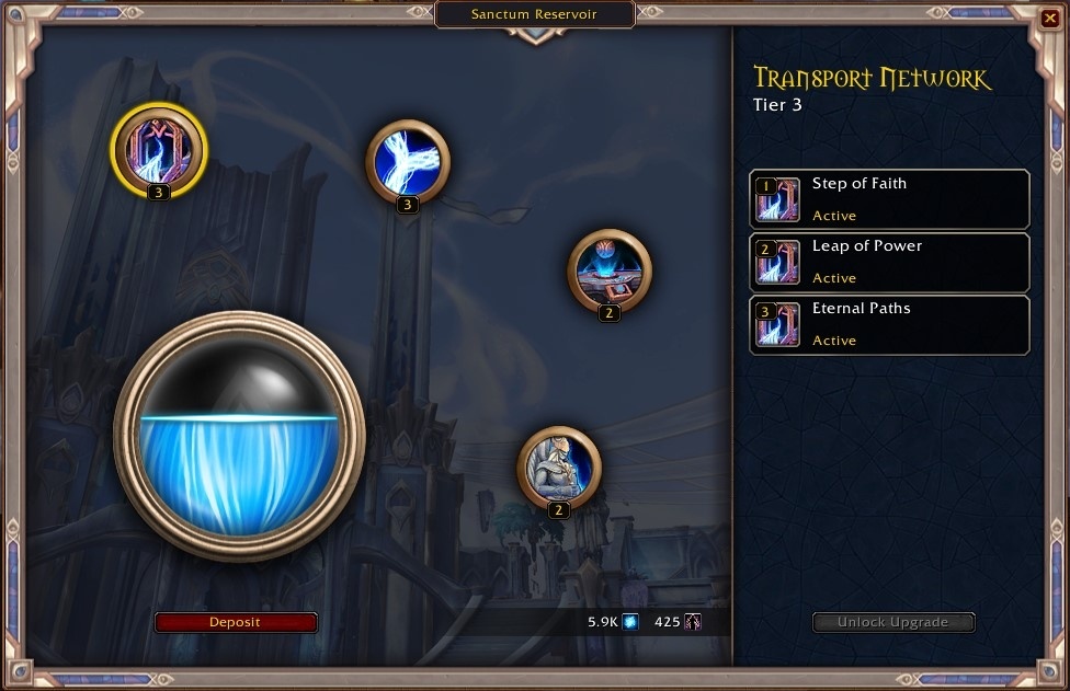 A partir de là, vous pourrez débloquer de nombreuses activités dans votre Sanctum, comme la fameuse table des missions, ou encore le réseau de transport. Qu’il s’agisse des Venthyrs, des Faë nocturnes, des Nécro-seigneurs ou encore des Kyrians, chacune des factions de l’Ombreterre peut se déplacer rapidement dans son propre royaume grâce à ces anciennes balises. Au total, trois tiers seront à débloquer aux prix respectifs de 2 000, 5 000 et 10 000 anima. Le coût peut sembler impressionner impressionnant mais ça se farm assez vite – ce sont plus les âmes rachetées qui poseront problème, comme indiqué dans notre guide sur les monnaies de Shadowlands.