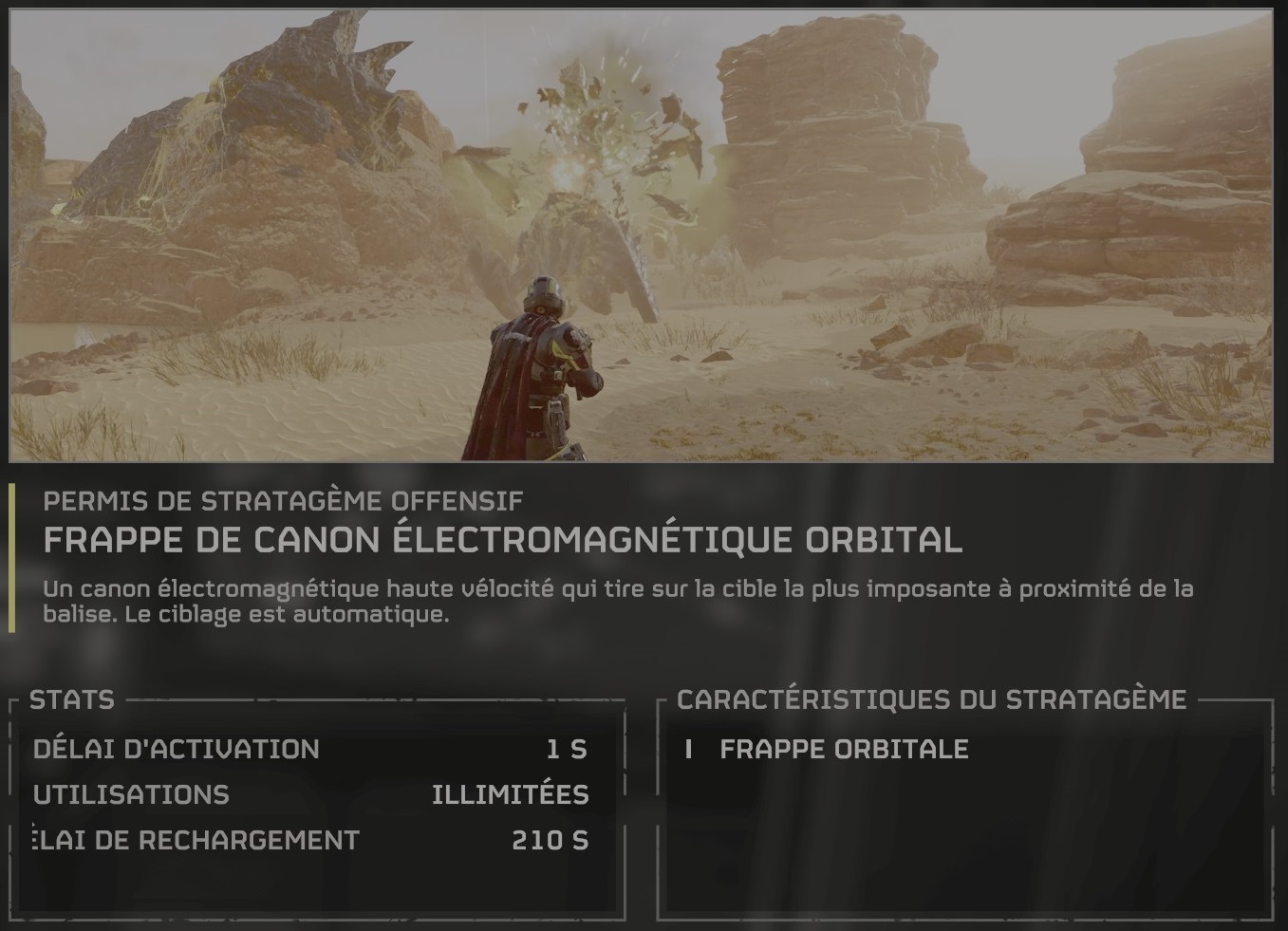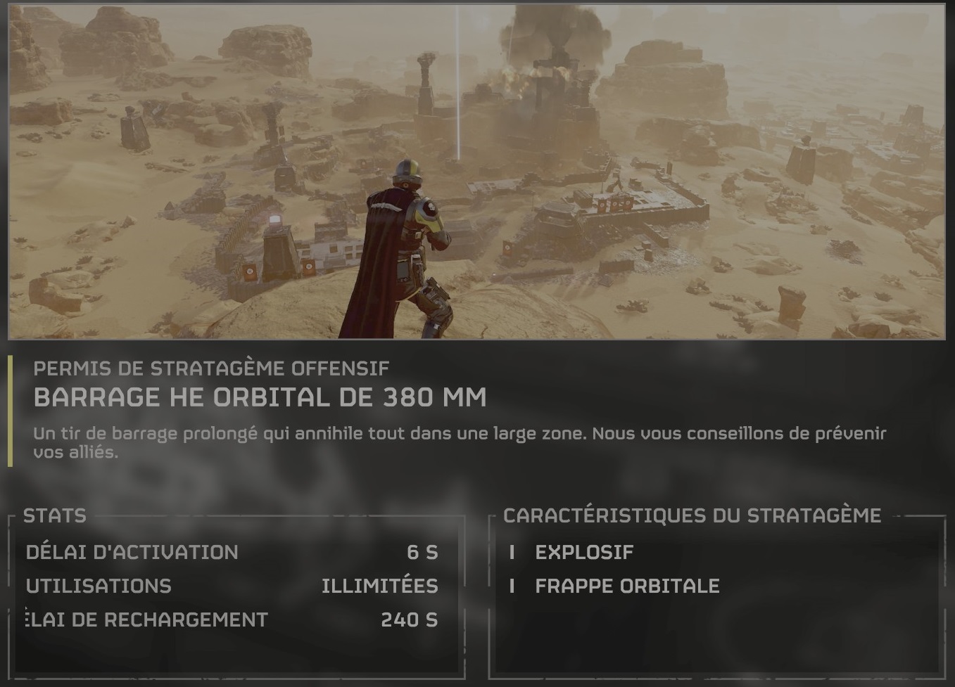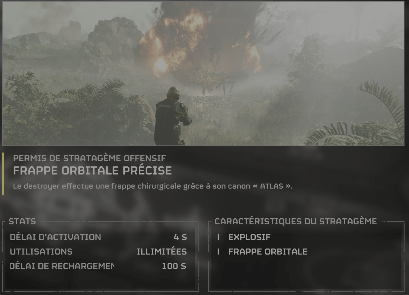 Grace à son nombre illimité d’utilisation, ce stratagème est un must have notamment dans les missions comprenant des Titans ou des Chargeurs. En effet, une fois la requête lancée, le laser va directement rechercher la plus grosse créature et l’exterminée. Cependant, il est bon de noter que pour l’instant le laser considère les Brood Commanders comme étant plus gros que les Chargeurs, alors que ces derniers sont bien plus difficile à tuer ! Nous vous conseillons de faire bien attention à ce qui se trouve autour de vous avant de recourir à ce stratagème.