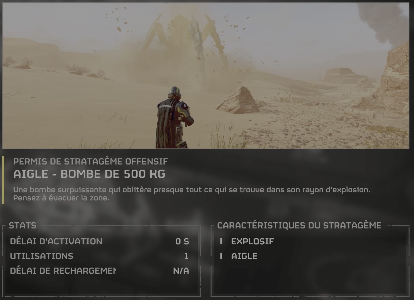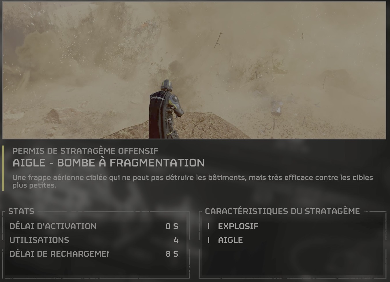 A.k.a la plus grosse explosion disponible du jeu, celle-ci vous permettra de décimer toutes vies présente dans son rayon d’action. Malgré son faible nombre d’utilisation, ce stratagème reste très cool à utiliser en particulier si vous vous appelez Nolan.