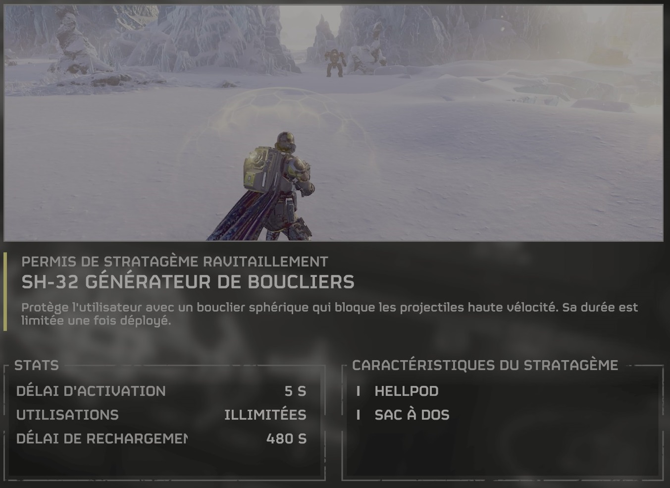 On en parlait un peu plus haut, un excellent stratagème à avoir dans sa liste. Le bouclier bloque les dégâts jusqu’à un certain niveau avant de se briser. Rassurez vous, si vous ne prenez pas de dégâts durant un certain temps, celui-ci se recharge rapidement. Ce shield est parfait pour éviter les dégâts qui vous ralentissent, ou encore les dégâts d’ennemis au corps à corps.
