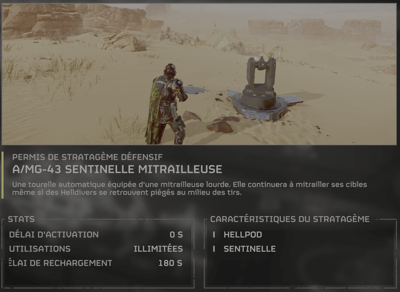 Ici, nous parlons d’un drone qui vous suis partout et permet une couverture à 360°. Celui-ci attaquera tout ce qui vous approchera de trop près. C’est le stratagème idéale lorsque vous rechargez votre arme, ou bien durant votre fuite vers le point d’extraction. Cependant, n’essayez pas d’être discret quand vous l’utiliser car il tirera malgré tout sur tout vos ennemis.