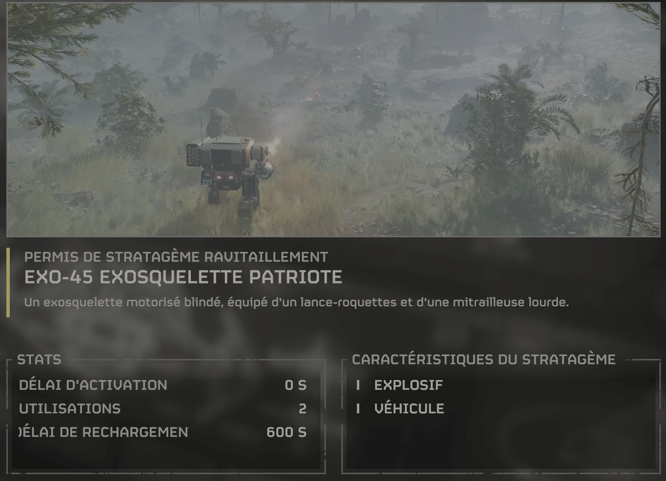 Certes, c’est un stratagème débloqué à un haut niveau mais, il fait parti des redoutables de cette liste. Véritable arsenal sur patte, l’exosquelette dispose d’un lance-roquettes sur un bras et d’une gatling sur l’autre. Veillez à utiliser les roquettes de manière ingénieuse, celles-ci sont particulièrement efficaces pour anéantir une grosse cible blindée.