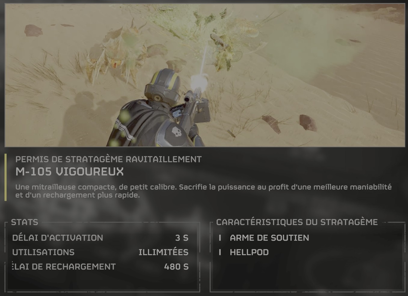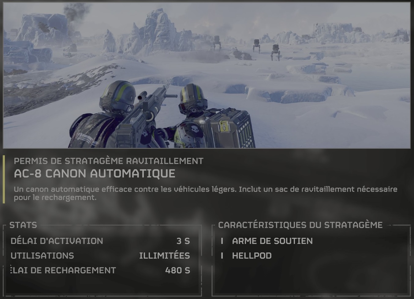 Plus léger que la mitrailleuse, son temps de rechargement est bien plus rapide, ce qui en fait un stratagème très intéressant pour vos débuts. Associé à un sac de ravitaillement et plus rien ne vous arrêtera, ou presque. En effet, cette arme aura bien du mal à passé au travers du blindage de certains ennemis.