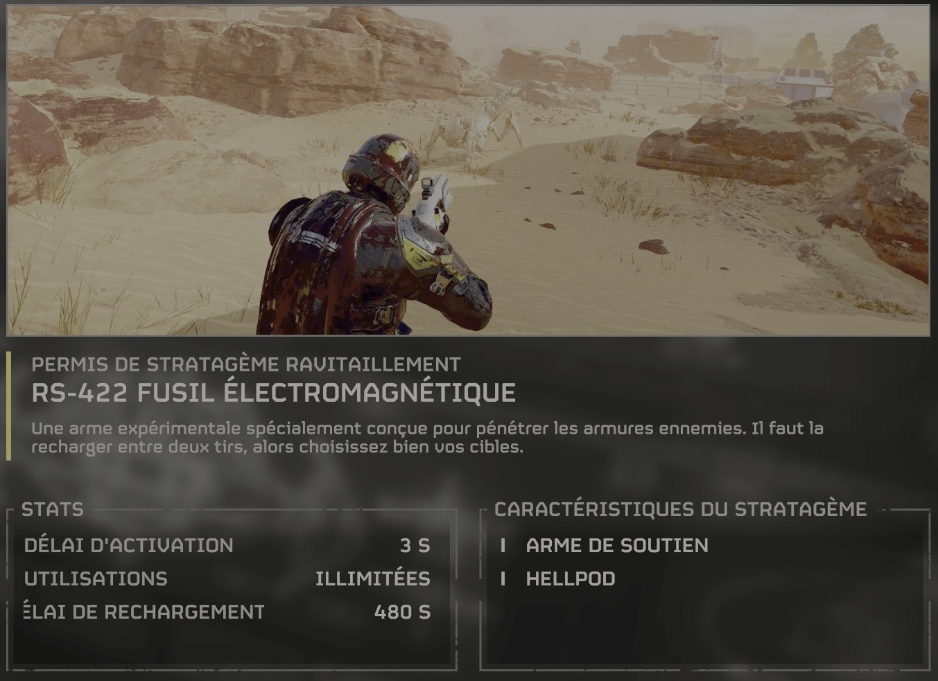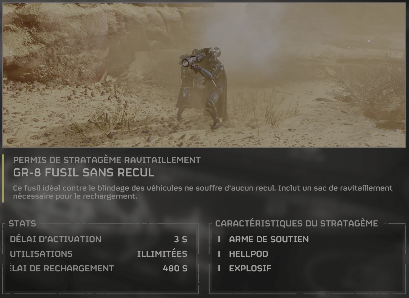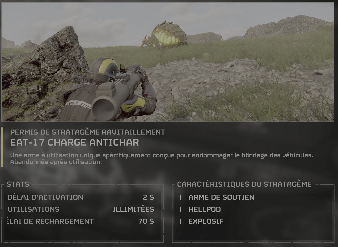 Probablement l’une des meilleures armes end-games de Helldivers 2 ! Ainsi, vous pouvez maintenant charger votre tir en direction des jambes d’un Chargeur afin de l’abattre plus facilement ! N’oubliez pas de retirer sa sécurité avant de l’utiliser ! En effet, cette arme permet de charger un tir, si vous charger un petit peu trop longtemps, elle risque de vous exploser entre les mains. En définitive, c’est une arme très efficace contre les blindages et nécessitant peu de munition, on adore !