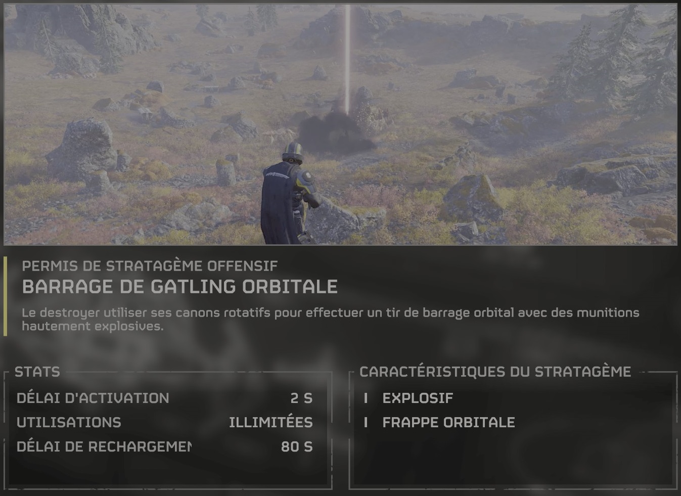 Le problème majeur avec les barrages orbitaux c’est que leur zone d’effet est un peu flou pour les alliés, vous avez 80% de chance de les tuer sans pour autant tuer votre cible initiale. C’est là que le barrage de gatling entre en jeu, en effet, sa zone d’effet est précise, moins puissant que d’autres barrages, mais vous aurez plus de chance de tuer la bonne cible. En prime ce stratagème offre un temps de rechargement court, de quoi vous amuser !