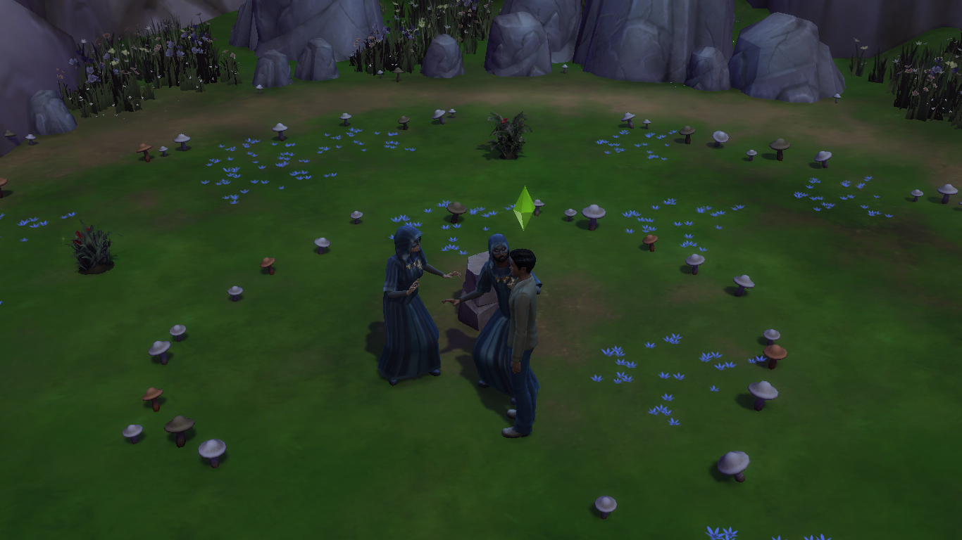 Ils posent des objets sur un rocher, qui disparaissent ensuite. Mon Sim ayant été intrigué, il est allé poser des questions à un de ces membres , qui lui a répondu en bafouillant qu’il faisait partie d’un club de jardinage – bien sûr, puis s’est enfui en courant avec ses acolytes. Mon Sim continue son semestre en faisant des offrandes à la statue de son université, puis vers la fin du 2ème semestre, il reçoit un message du membre de ce club qui lui propose de rejoindre la société secrète. Ni une, ni deux, mon Sim accepte.