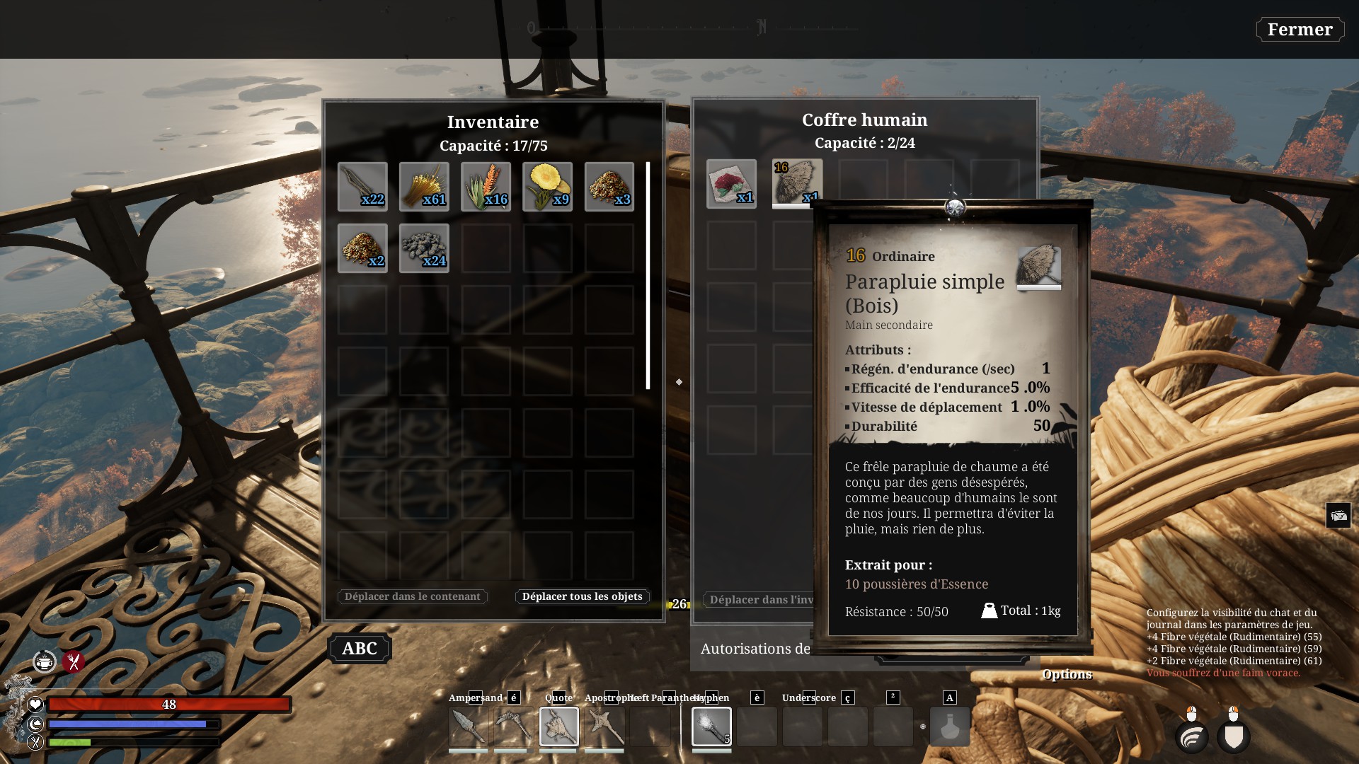 Obviously, un parapluie sert à protéger de la pluie me direz-vous. Dans Nightingale, la pluie vous affichera une barre de progression affichant « Humidité« . Si celle-ci se remplit entièrement, vous tomberez malade ! La solution pour éviter ça est de soit sortir de l’eau, soit de se mettre à couvert dans une structure (avec un toit, c’est mieux) ou de sortir votre super parapluie !