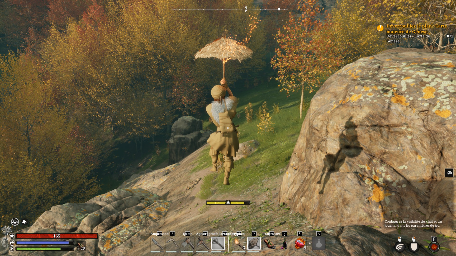 - Explorer le biome marais, dans le tutoriel, est la solution la plus simple. Si vous sortez légèrement des sentiers du tuto pour explorer un peu la zone, vous trouverez un parapluie dans l’un des coffres d’une des tours pleine d’ennemis.